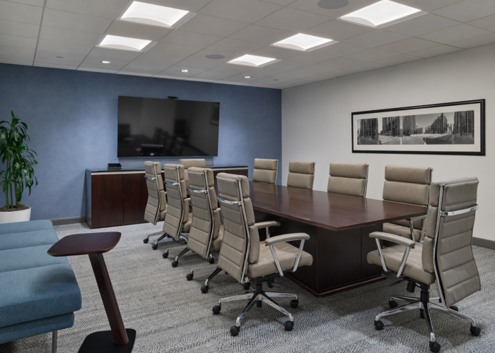 The buildout brought together two existing suites into a cohesive layout, creating a balanced mix of private offices, open work areas, and conference rooms. A new reception area and glass-front meeting spaces establish a strong front-of-house presence, while a café-style breakroom and lounge areas support day-to-day collaboration. Updated finishes and lighting create a clean, modern environment that enhances both functionality and overall experience.